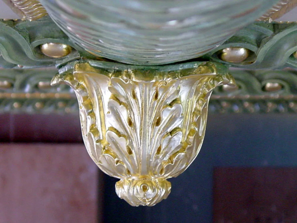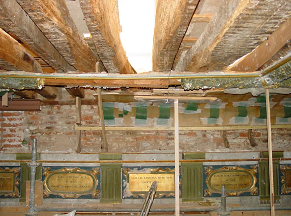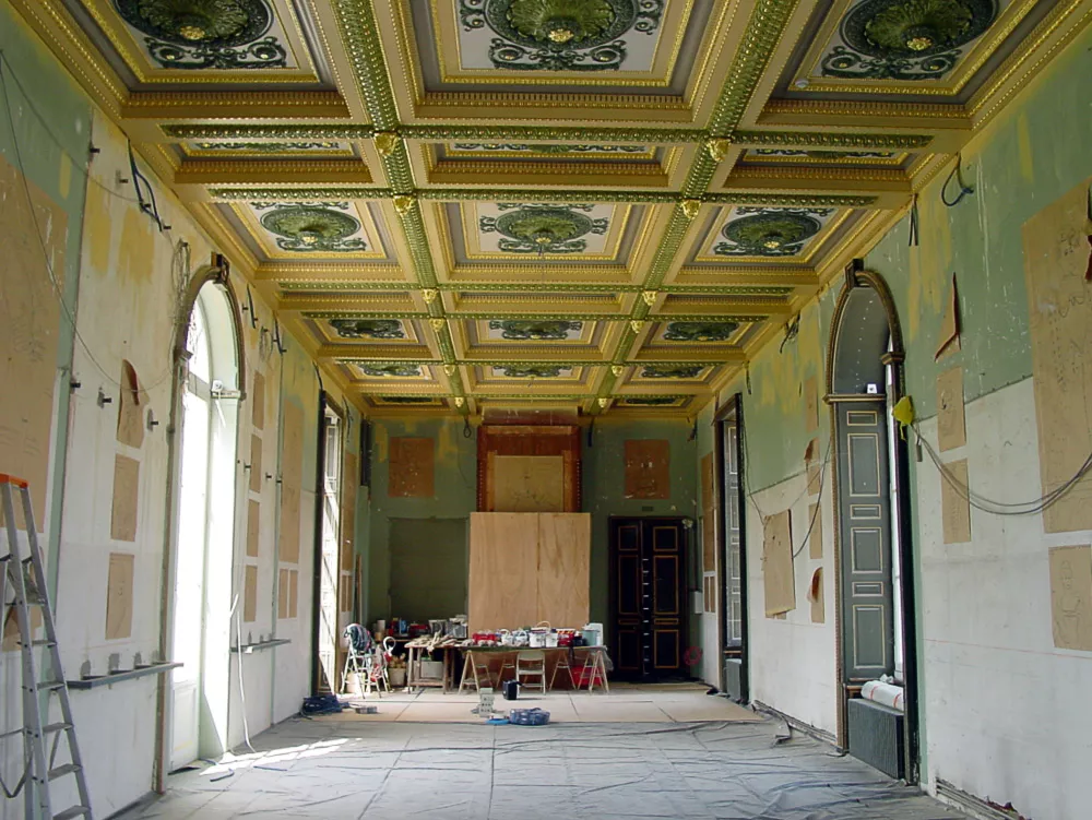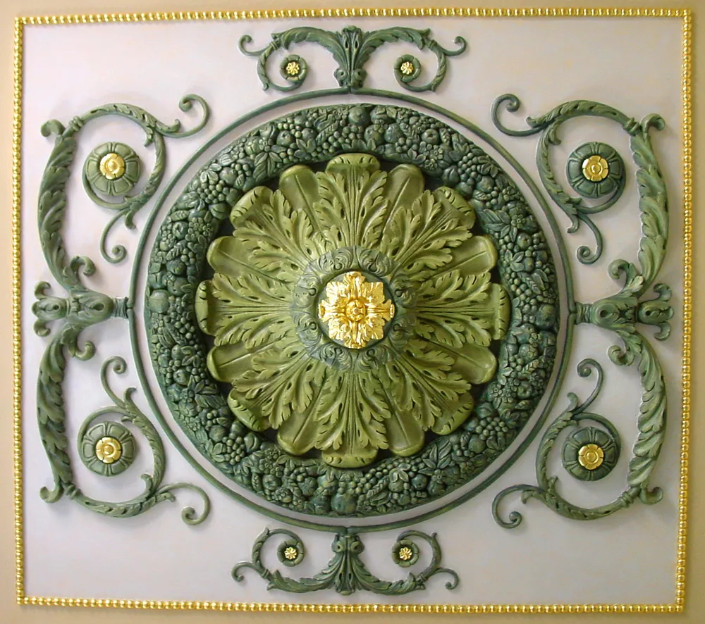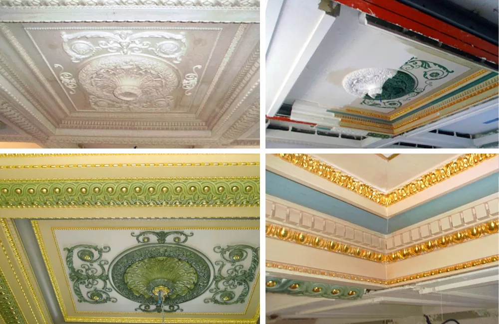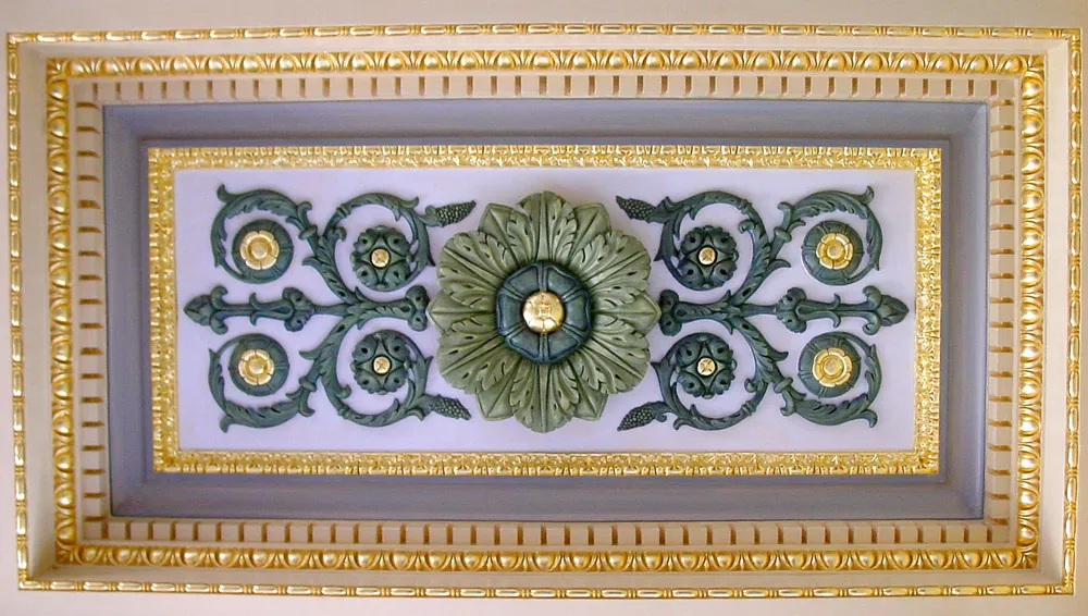Ouvrages en staff comprenant caissons avec entrelacs, rangées de perles, rinceaux, roses de chœur, feuilles d’acanthe, moulures rapportées, corniches.