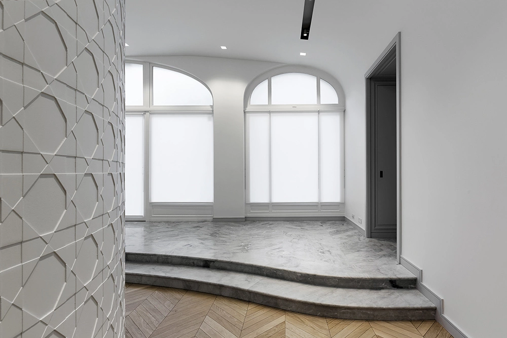 Indirect lighting, subtly integrated into the upper and lower sections, delicately reveals the relief and depth of the textures, giving the space a precious, elegant and resolutely timeless atmosphere.