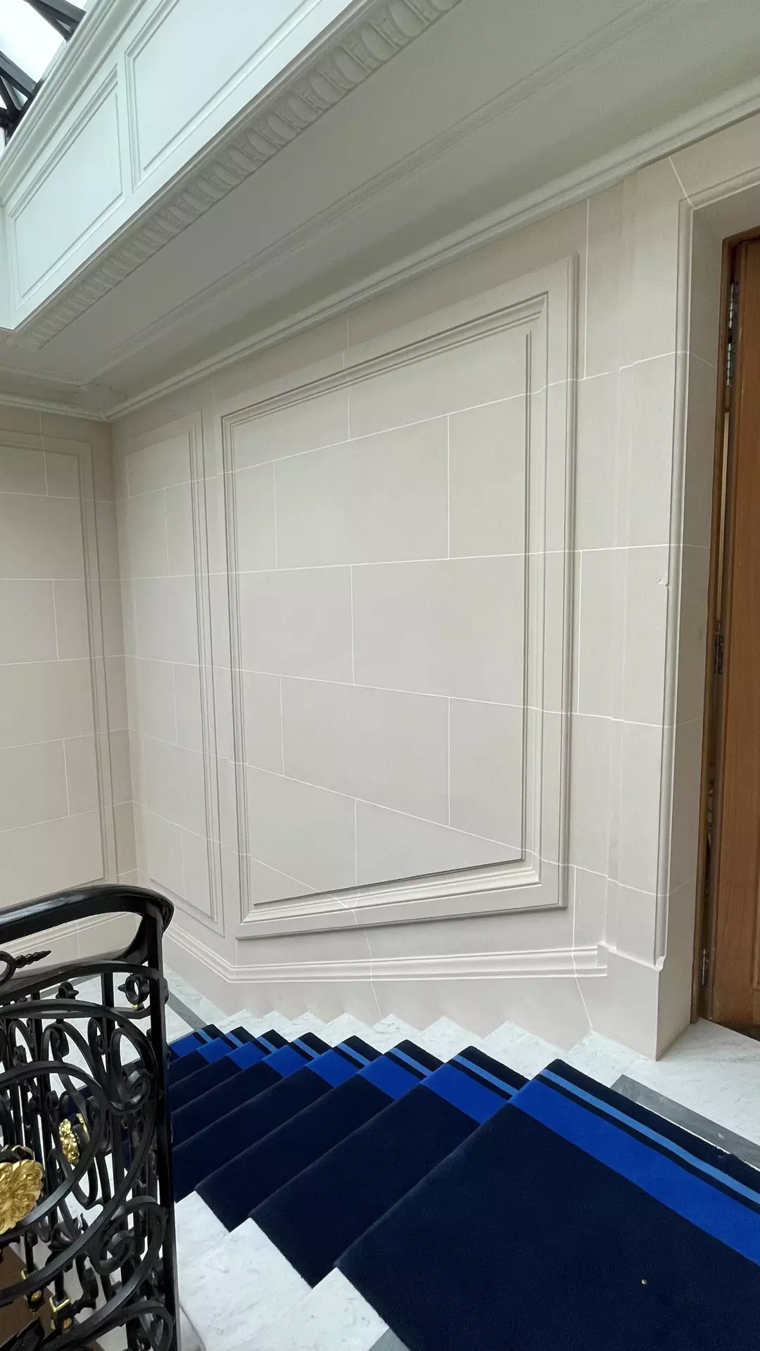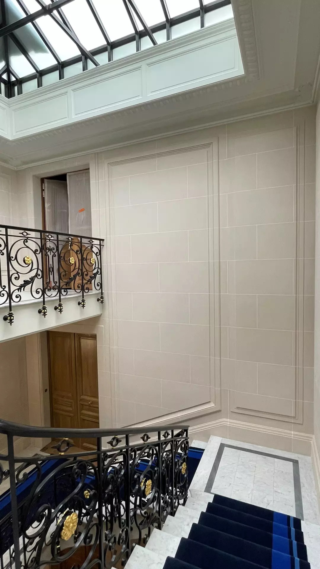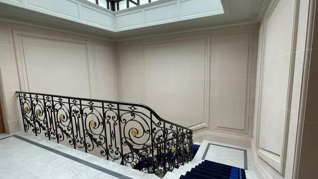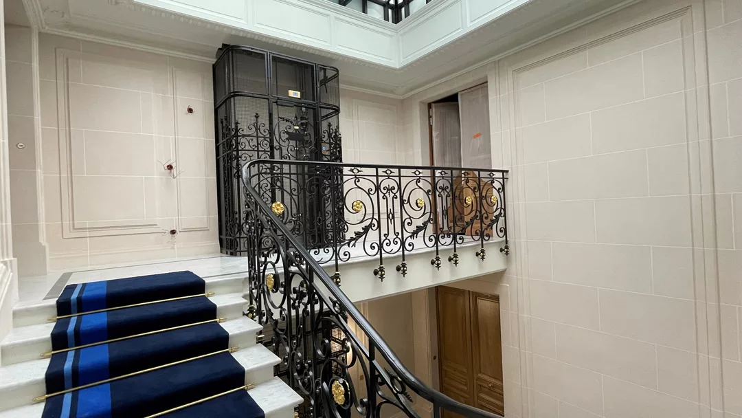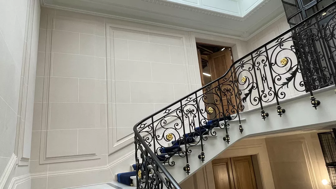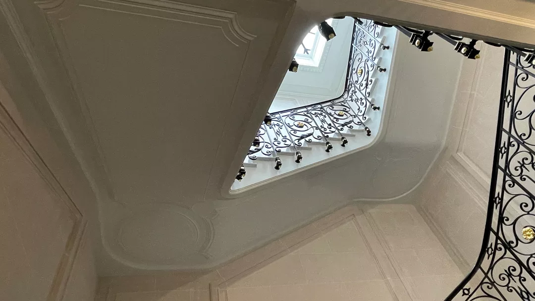 The work involved creating moulded panels, cornices, landing door frames, as well as ceilings and stairwell volumes, a central feature of the building. Every detail was carefully studied to ensure perfect continuity between the existing parts and the recreated elements.
