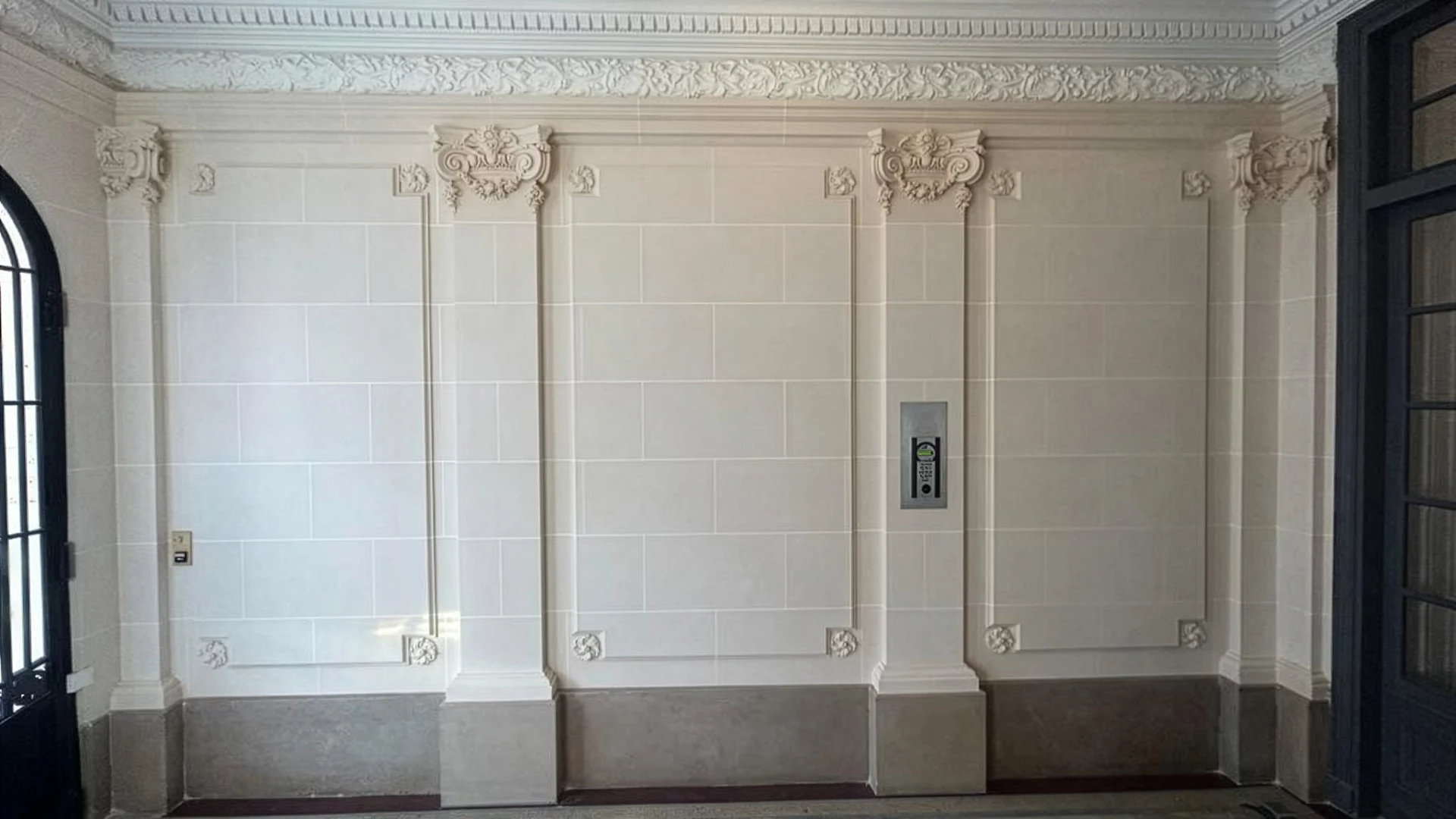 The marble stucco on the baseboards was restored to its former glory to better highlight the stone stucco.