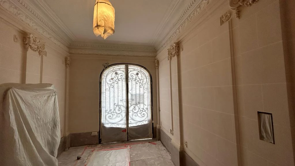 This project, located on Boulevard du Montparnasse, illustrates an interior restoration carried out with respect for the original architecture. The stone stucco decorations were carefully recreated in order to restore the full effect of the volumes: wall panels punctuated by pilasters, finely sculpted cornices and decorative frames structure the space with balance and sobriety.