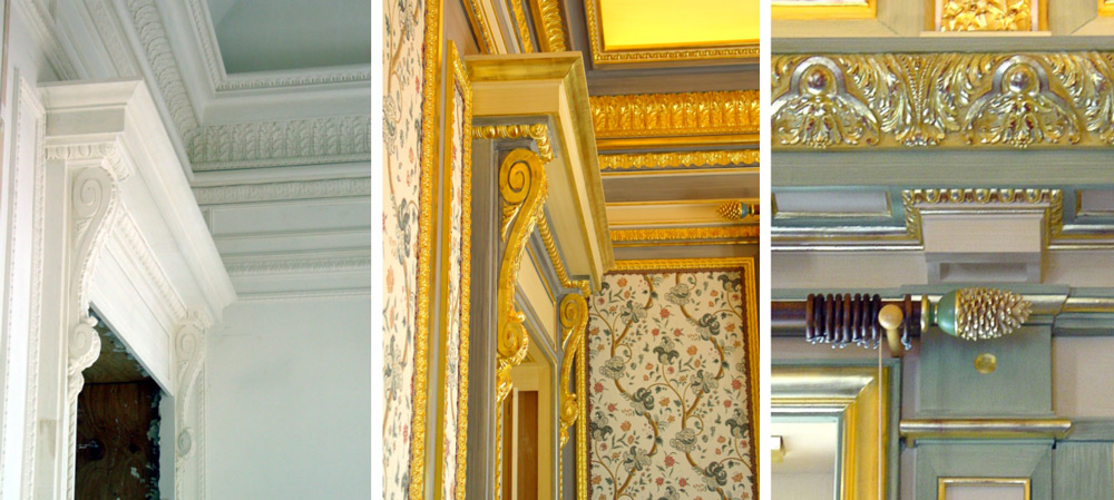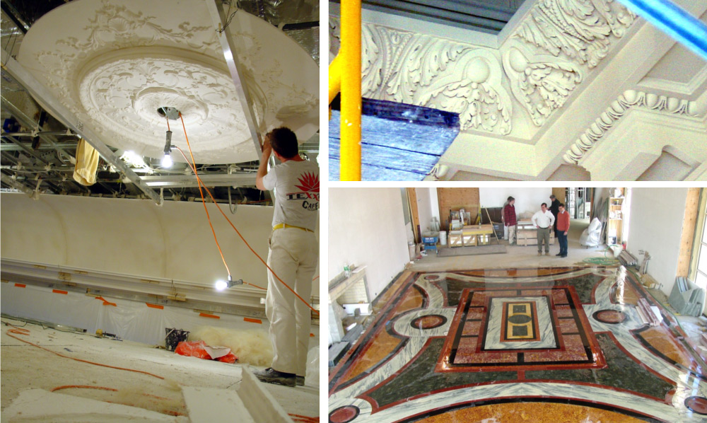 Decorative staff work for the walls and ceilings of the sun room, living room and dining room of a seaside property under construction.