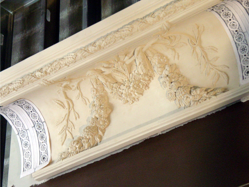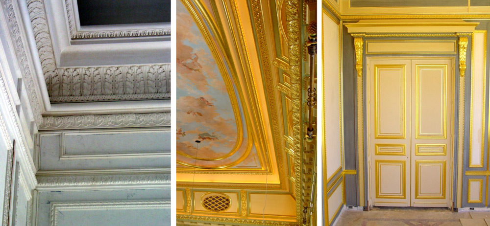 The cornices were cast in several successive tiers due to their substantial dimensions (up to 2.50 m of drop in the living room).