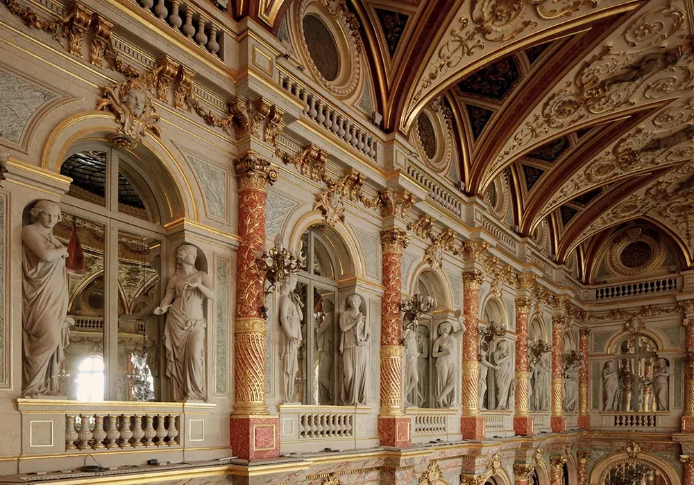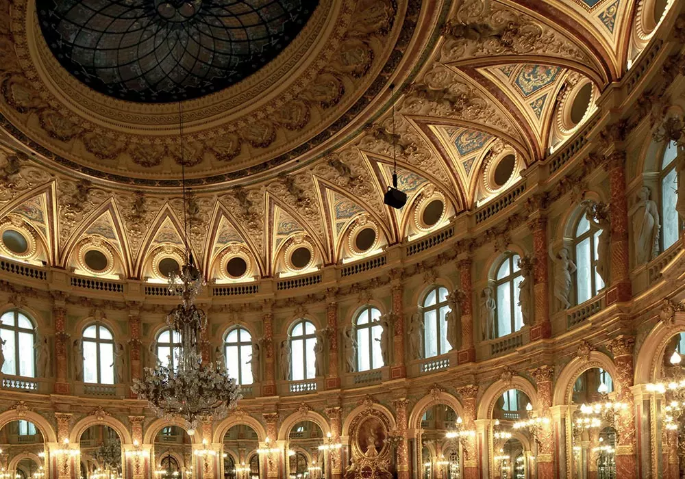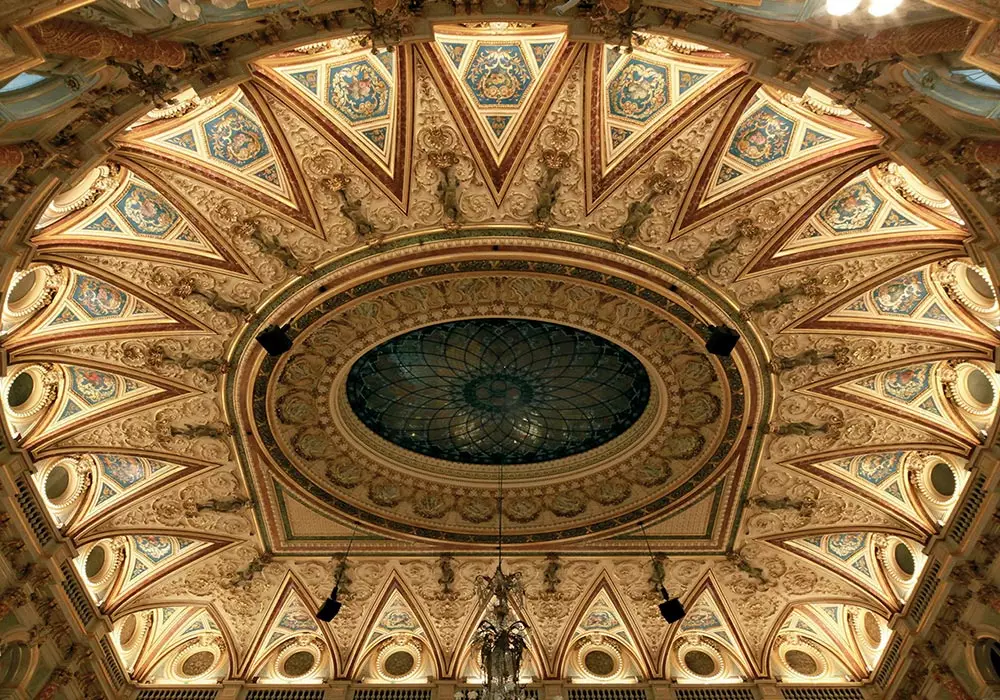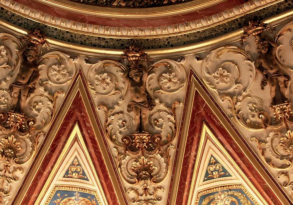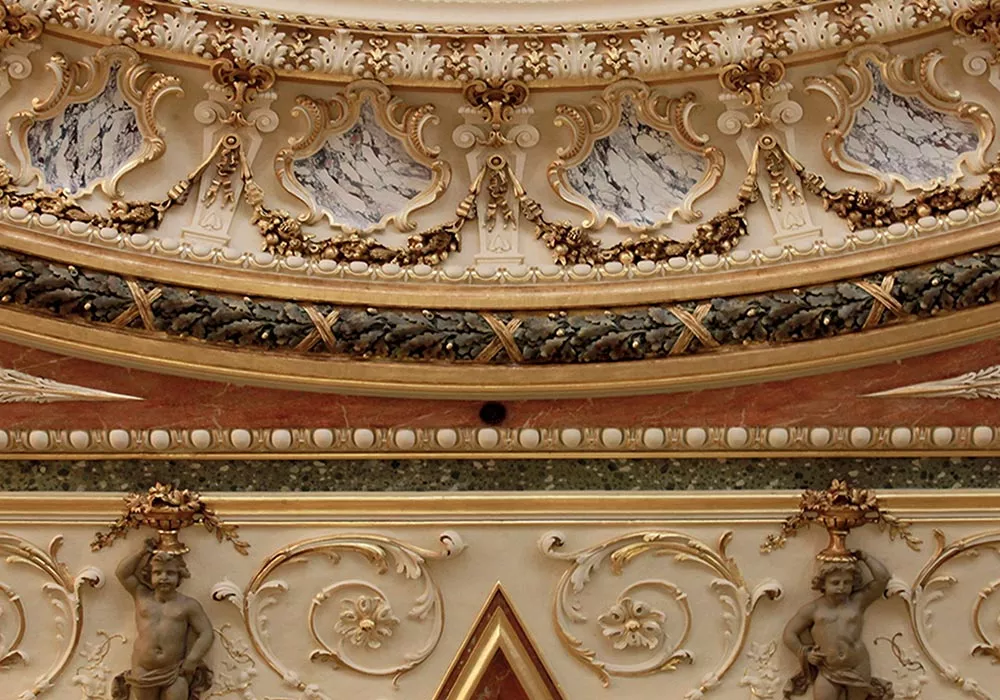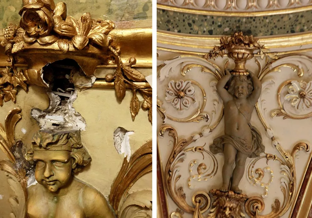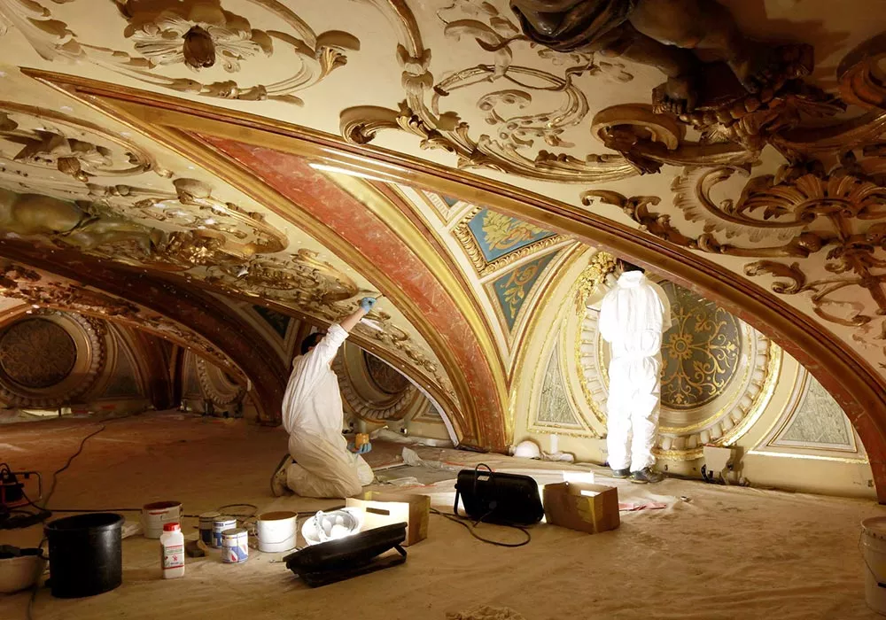 Reconsolidation de l’ensemble du plafond décoré du Grand Hôtel InterContinental de Paris, comprenant percement de milliers de trous pour insérer des tiges et des résines afin de consolider la masse de plâtre suspendue à la charpente en bois et en métal du bâtiment.