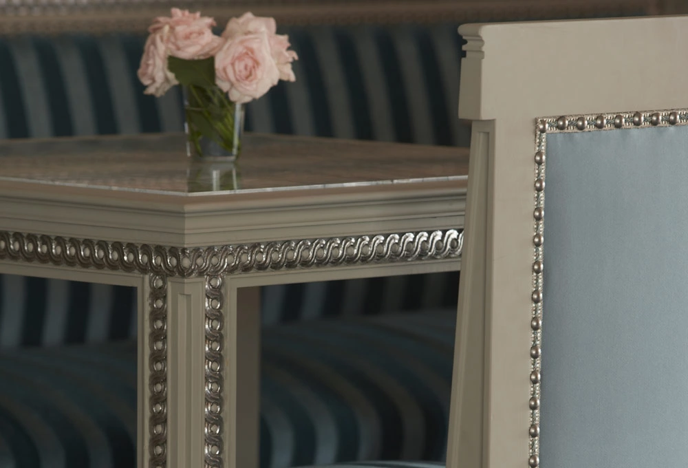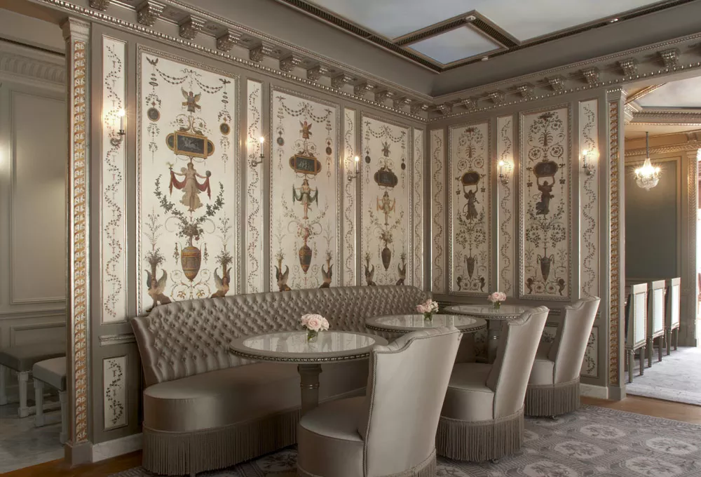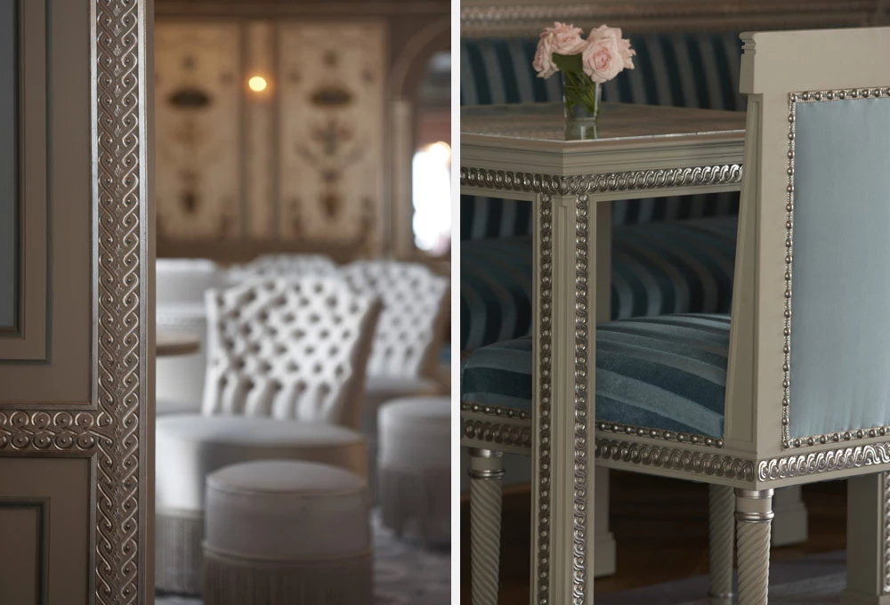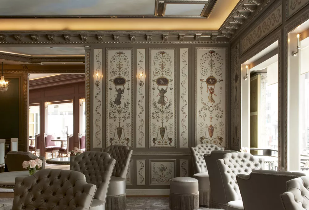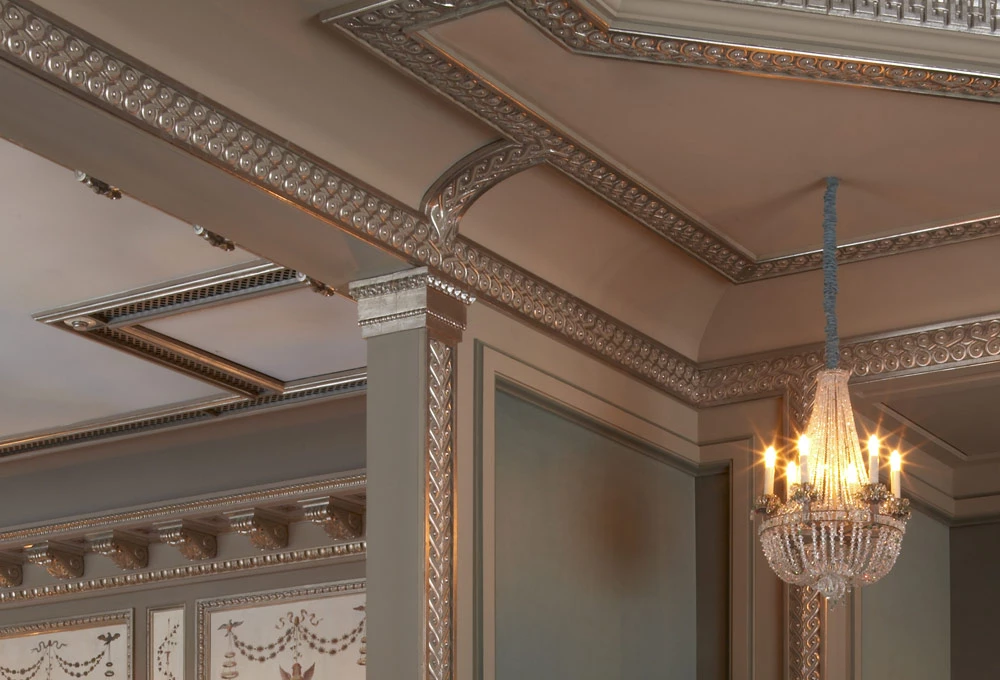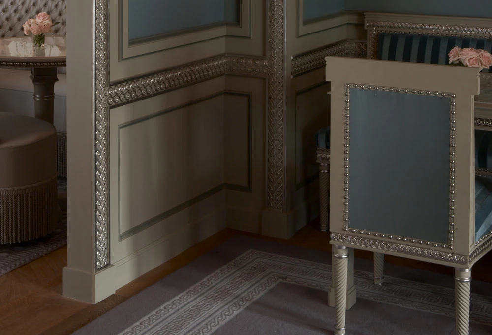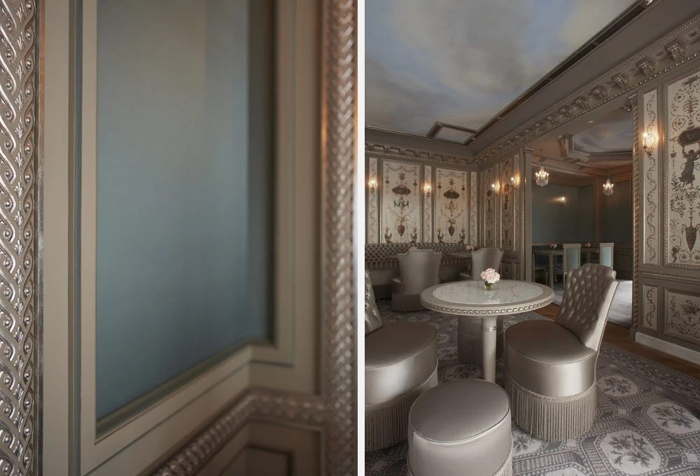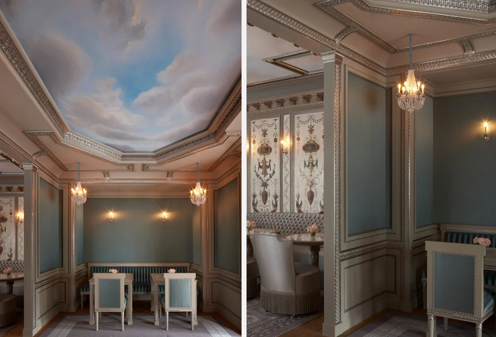 Les moulures ornées, les chapiteaux et les corniches, intégrant parfois des gorges lumineuses, apportent élégance et sophistication à ce salon de thé, au cœur de la capitale japonaise.