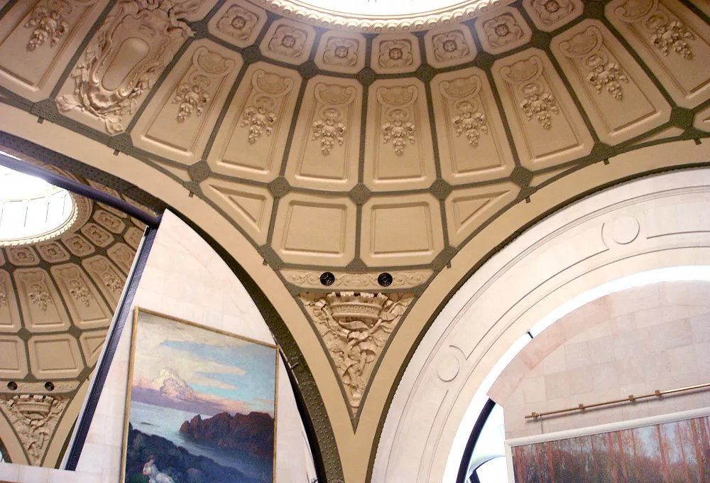 Réalisation de cimaises en stuc romain dans la galerie des hauteurs avec résonateurs acoustiques et viroles pour accrocher les œuvres.