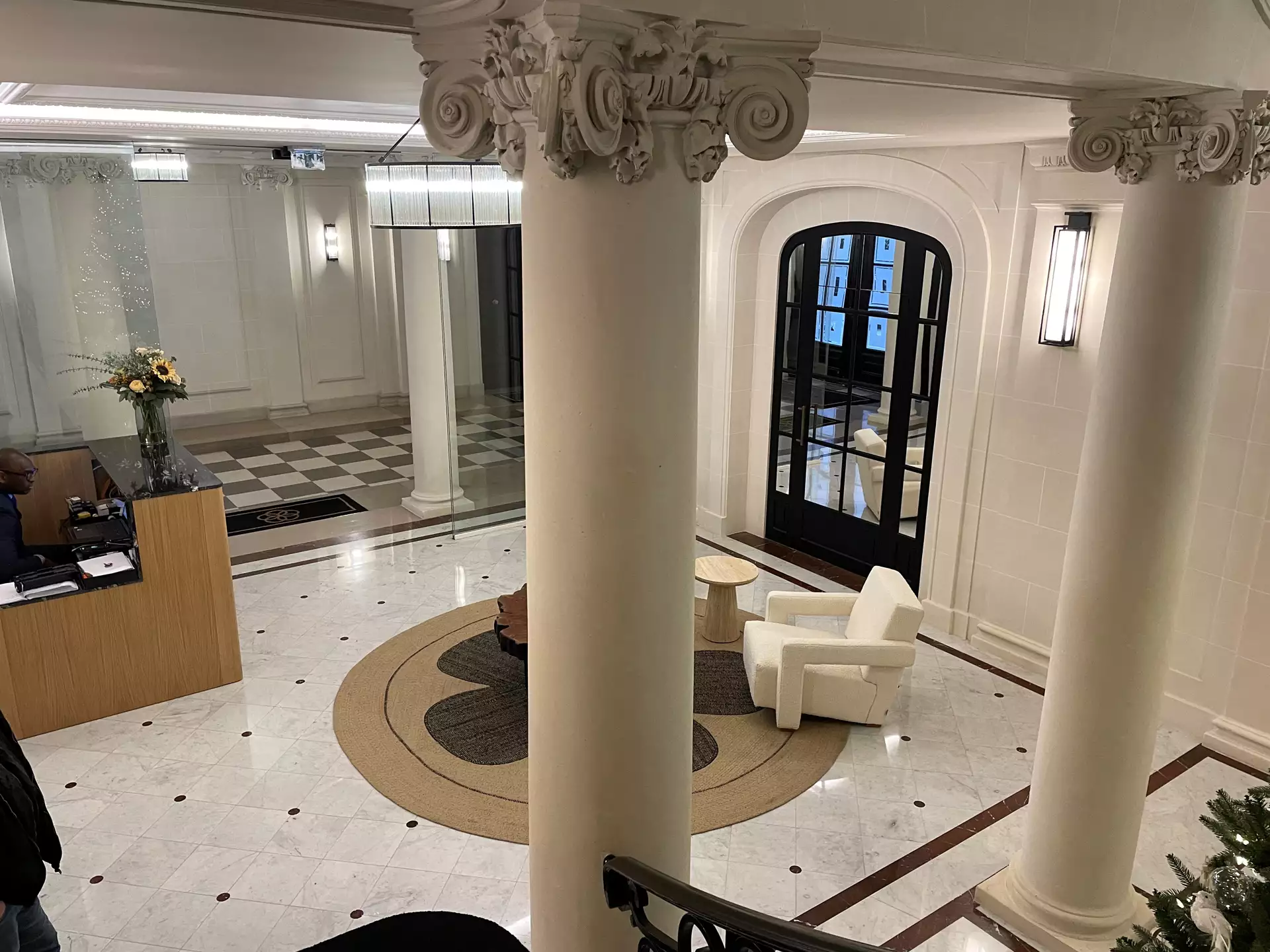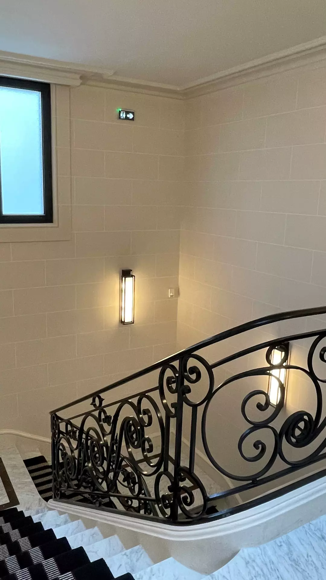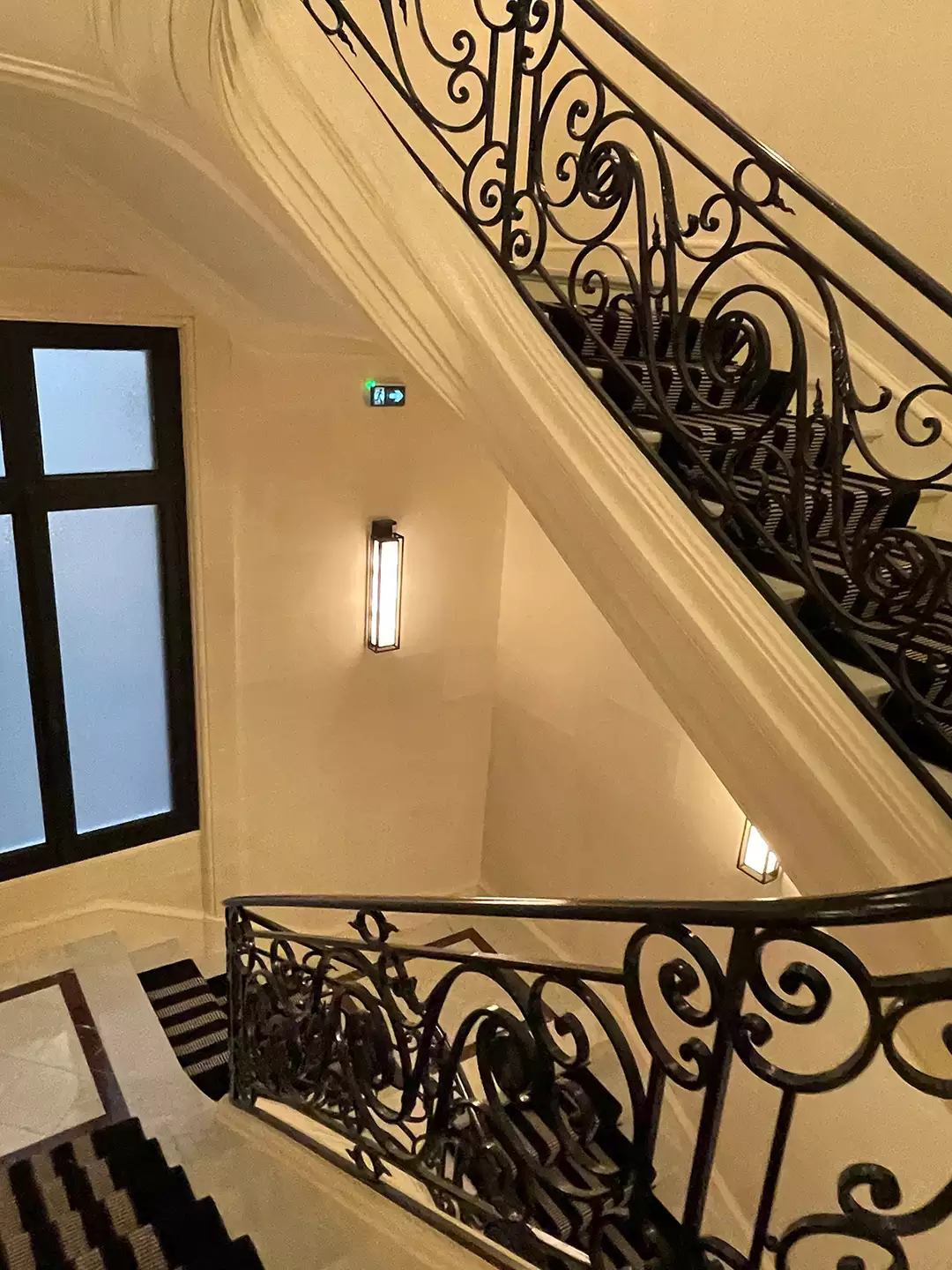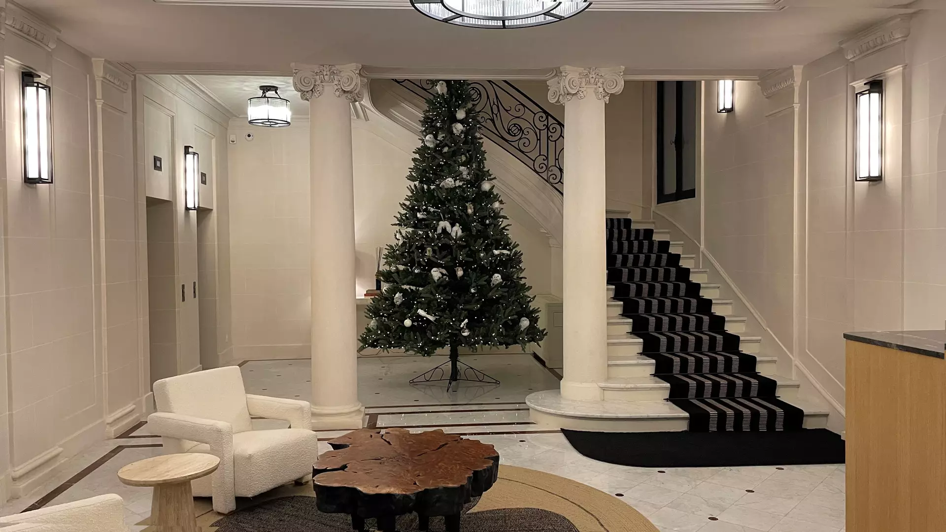 La cage d’escalier principal et halls ont fait l’objet d’un soin particulier, mêlant restauration fidèle et intégration contemporaine discrète.