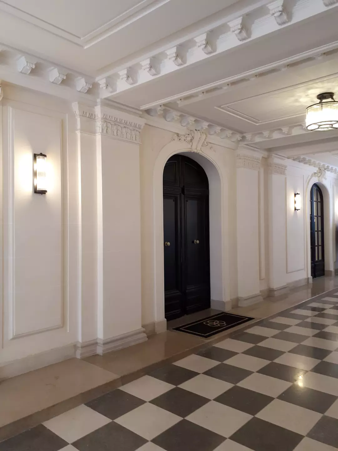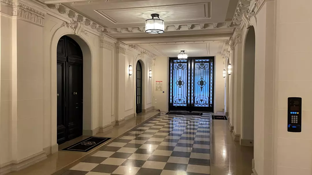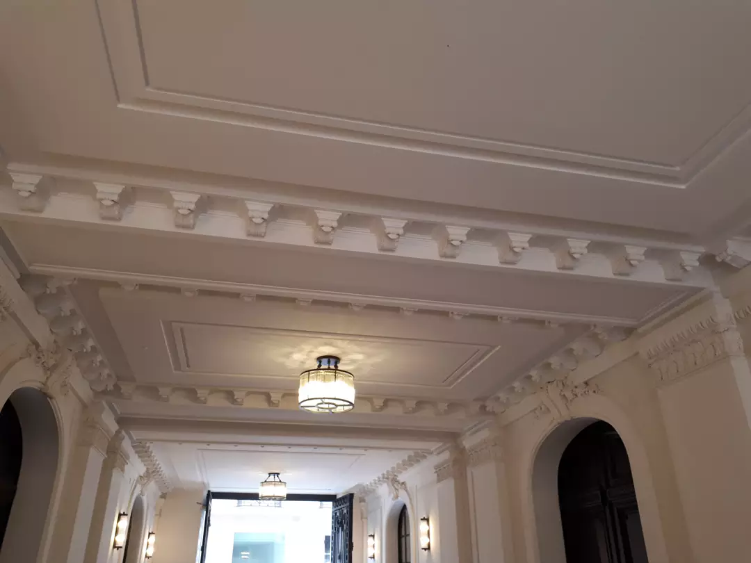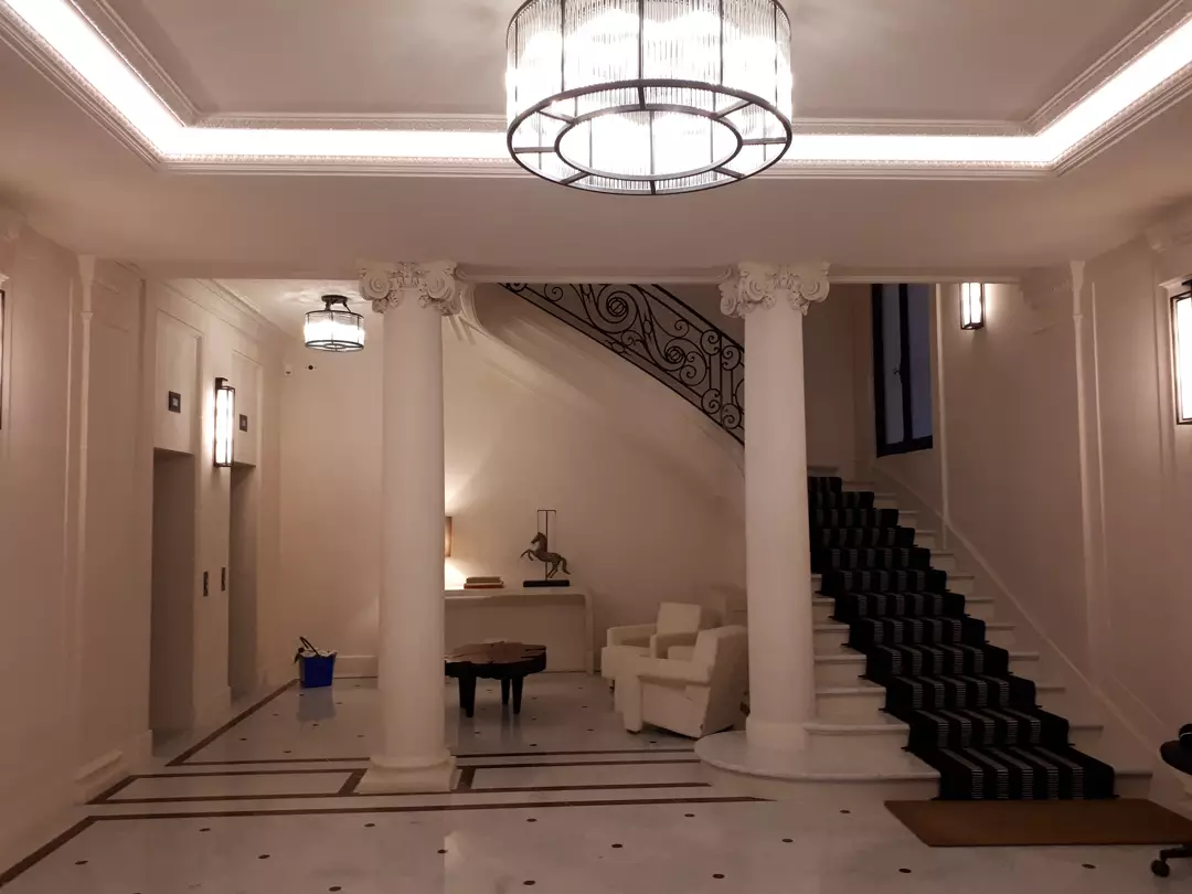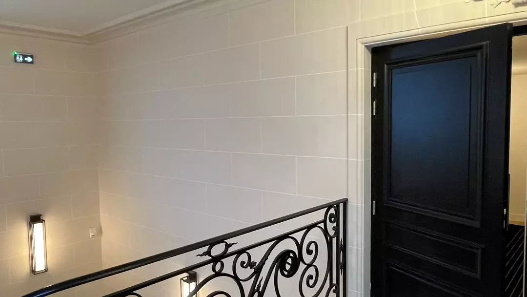 Cette réalisation rue Saint-Dominique s’inscrit dans une rénovation complète de parties communes à forte valeur patrimoniale. Les équipes S.O.E sont intervenues pour restituer un décor architectural classique, structuré par des moulures murales, corniches, encadrements et pilastres en stuc pierre, réalisés sur mesure dans le respect des proportions et de l’ordonnancement d’origine.